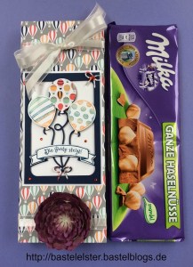 Liebe Bastelfreunde, die Lieblingsschokolade meines Mannes ist Milka Nuß. Deshalb habe ich zu seinem Geburtstag eine Verpackung für eine 300 g Schokolade gebastelt. Dafür habe ich das Stempelset „Ballonparty“ und dieThinlits Formen „Pop-up-Ballons“, benutzt. Eine Sukkulentenblüte verschönert die Verpackung. Liebe Grüße Viola.