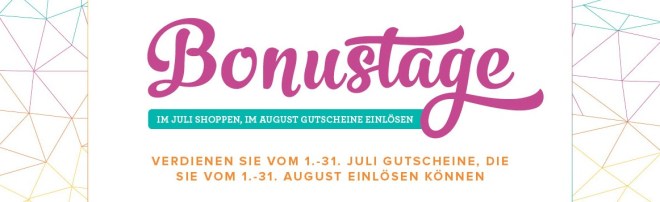 Sie sind wieder da! Vom 1. bis zum 31. Juli gibt es im Rahmen der Aktion „Bonustage“ bei jeder Bestellung für je 60 € Bestellwert (Katalogpreise zzgl. Versandkosten) einen Gutschein im Wert von 6 €, der vom 1. bis zum 31. August einlösbar ist.